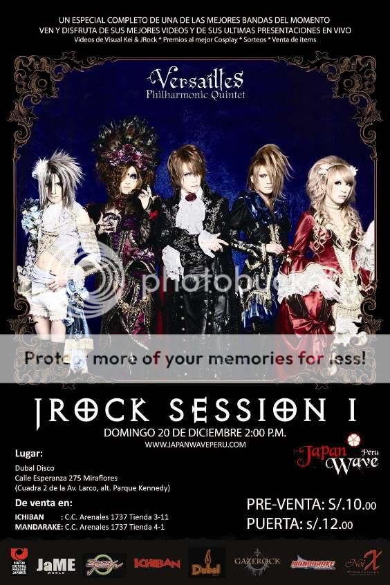 y... GazeRock]El primer TEAM de apoyo a la JMusic en Perú, JAPANWAVEPERU se complace en anunciar la realización de la serie de eventos titulada "JROCK SESSION", son siete proyecciones que serán producidas con un lapso de 2 meses de diferencia entre una y otra, (es la primera vez en nuestro país que eventos de JRock y Visual Kei a gran escala serán realizados de forma seguida) teniendo la peculiaridad de presentar un especial de una banda o artista determinado, habiendo estos sido escogidos por los mismos fans a través del poll en la pagina oficial de JAPANWAVEPERU. Las bandas que participarán con un especial de dos horas serán: